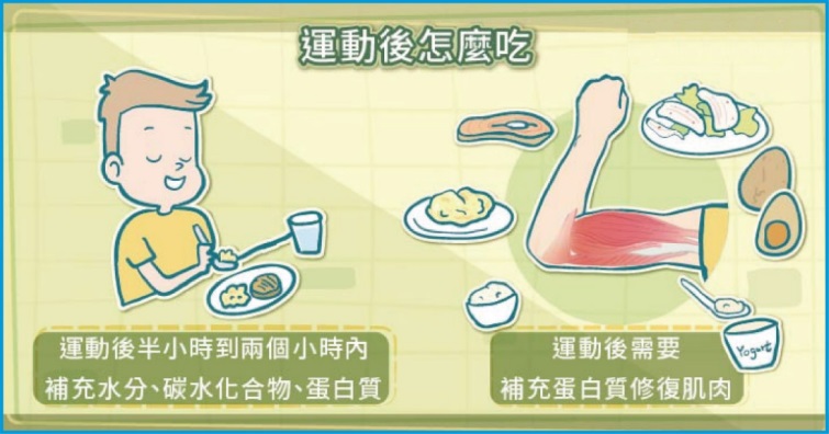 建議運動後半小時-2小時補充足夠蛋白質,建議每天每公斤體重攝取1.6克蛋白質。