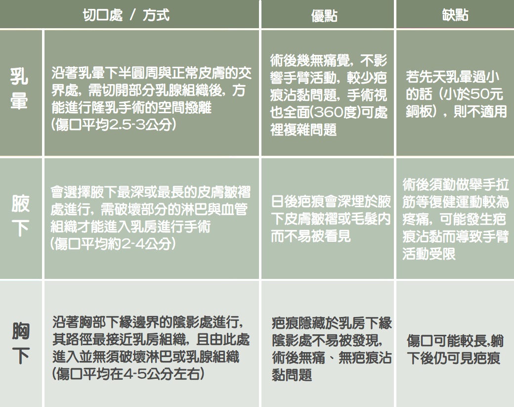 其實無論經由何處切口都可以進行各義乳植入與空間撥離,所以沒有絕對的好壞分別