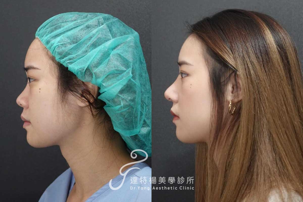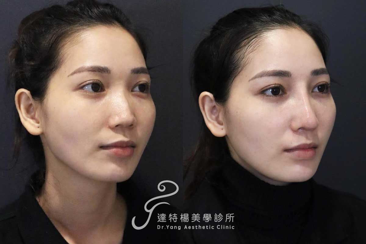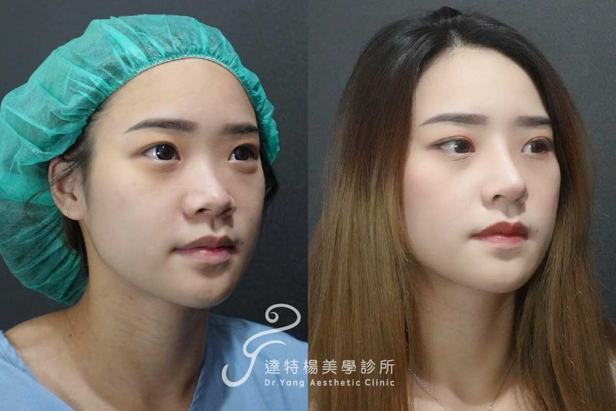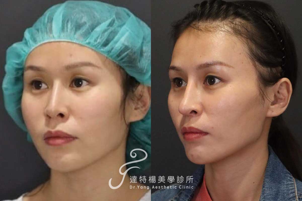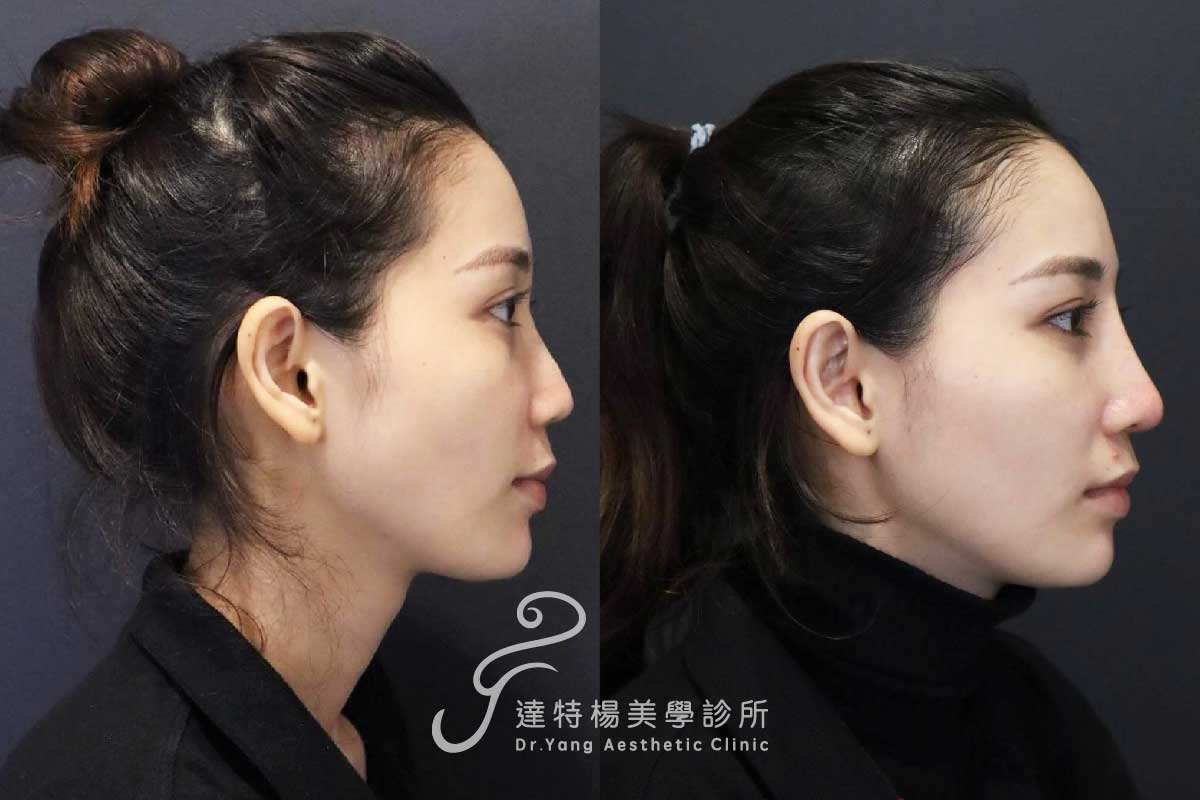 這位美眉透過三段式隆鼻改善了鼻柱不順暢的問題,原先的鼻型讓美眉看起來比較剛烈,三段式隆鼻手術(又稱為複合式、結構式隆鼻),透過假體或自肋墊高延長鼻梁,再取適合的耳軟骨來撐起鼻頭的部分,讓鼻尖能更好的塑形也能有保護鼻頭不被鼻模刺穿的風險,延長鼻中膈軟骨的部分,讓鼻型更加挺拔。三段式隆鼻手術過程比較繁瑣且環環相扣,非常考驗醫師的技術及美感,全方位的考量才能朔造出客製化的理想鼻型。