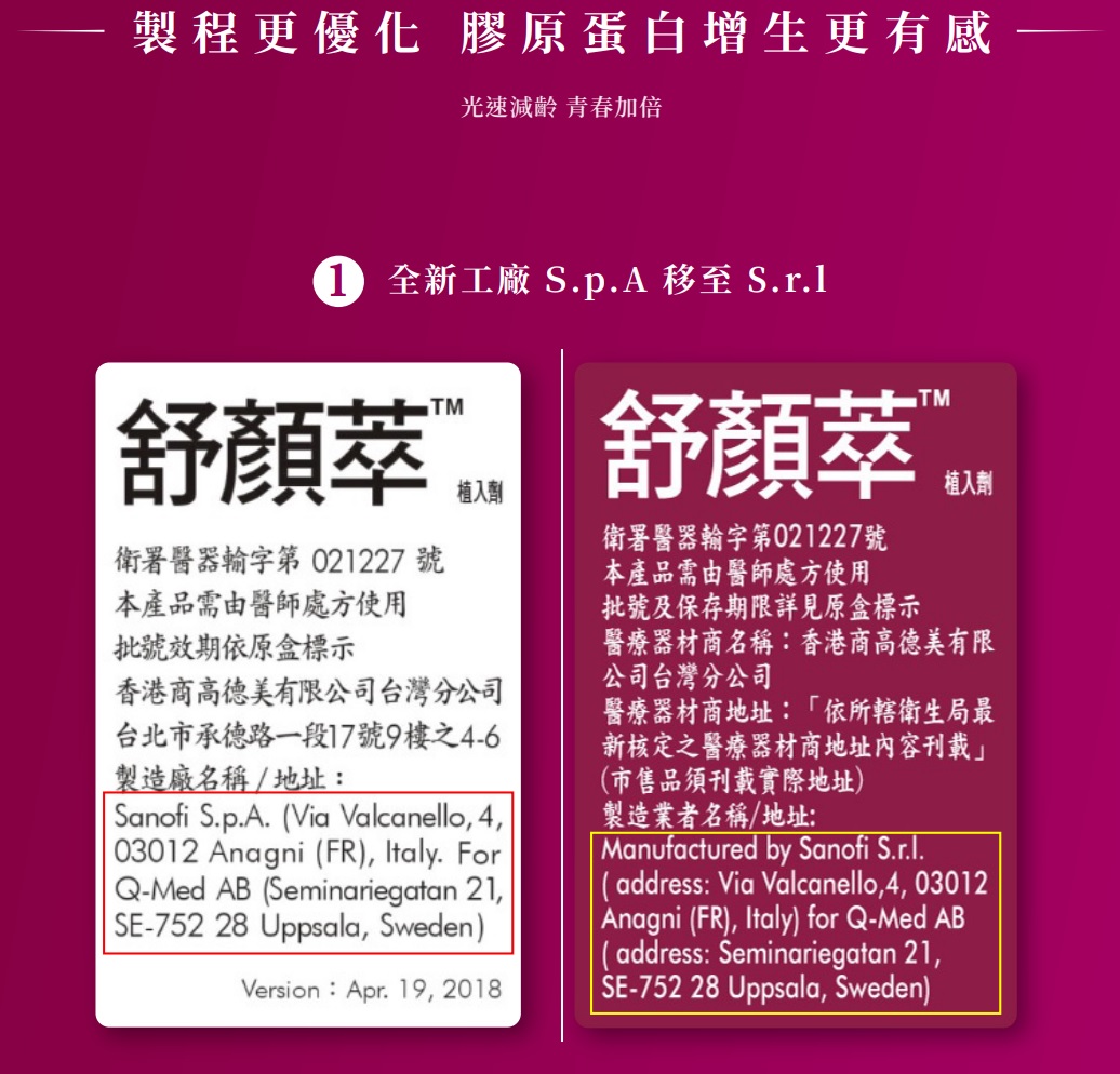 副作用: 1. 首次注射舒顏萃 Sculptra可能會造成紅腫或瘀傷,通常會在數小時到1週內改善。也可能會產生血腫,但會在數小時到2週內改善。若有惡化或症狀延長的情形,請通知您的醫師。 2. 用舒顏萃 Sculptra治療可能會在治療部位產生小丘疹,這些皮下丘疹通常非肉眼可見且無症狀,可能只會在按摩治療部位時發現。然而,也曾有肉眼可見之結節通報 ( 有時在治療部位會發紅或變色 ),應回報這些情況及不良反應給您的醫師。 3.注射部位有可能延遲發生皮下結節 ( 在注射後1~14個月 ) ,有時延遲發生的時間可能長達2年 。在某些案例,皮下結節會自發性的消除或使用皮質類固醇施以結節內注射治療。若結節體積過大或發生在困難的部位 ( 如下眼瞼 ),且進行其他治療後仍持續存在,此時可能需要進行手術切除結節。 4.其他罕見的副作用包括:注射範圍潰瘍、出現過敏反應、皮膚增生(膠原蛋白及組織彈性過度增長)及/或萎縮(膠原蛋白及組織彈性減少)、不舒適 、疲乏及水腫。