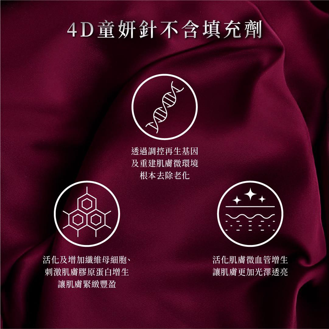 舒顏萃 Sculptra (4D童妍針): 綻放 逆齡風采 自1999年以來,舒顏萃 Sculptra已於全球多國、超過150,000位人士使用,而2009年美國FDA也正式核准舒顏萃 Sculptra(4D童妍針)改善老化徵狀的效果。在美國進行的前瞻性、隨機、對照臨床試驗,Sculptra已被證實,在第13個月可有效矯正不同凹陷程度的鼻唇溝,注射後最長可持續有效校正不同凹陷程度的鼻唇溝達25個月。 4D童妍針 調控肌膚再生基因 全球第一個再生型膠原蛋白增生劑