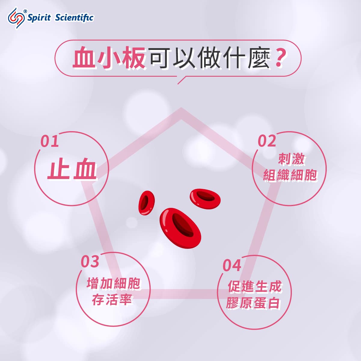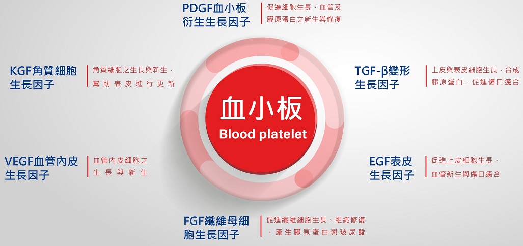 當血管破裂時,血液循環到附近其血小板會活化執行凝集反應,聚集附近的紅血球形成血餅,堵住血管破洞,阻止失血。血小板除了凝血功能外,血小板內含三種血小板顆粒,其中一種為 α顆粒 (α granule):內含各類蛋白質,也儲存各類生長因子參與細胞修復的過程,如PDGF、TGF-β、EGF、FGF、VEGF、KGF等等。這些生長因子從活化的血小板中被釋放到人體內,協助並促進各種組織細胞的生長與修復,是為人體自我修復機制中重要的一環。比如,PDGF 能促進細胞生長、分化,膠原蛋白合成,骨細胞增生;EGF 刺激細胞增生與分化等。