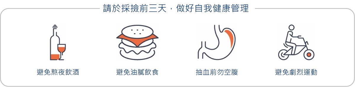 ●避免熬夜喝酒 ●避免油膩飲食 ●避免劇烈運動 ●抽血前勿空腹 ●請避開生理期 PLT採血須注意者