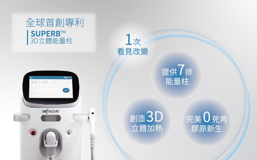 如果說電音雙波是新時代的發明,Sofwave索夫波就是新一波的劃時代的抗老黑科技,單一療程結合了電波的緊緻和音波的拉提優勢,以SUPERB專利技術3D立體能量柱創造容積式加熱,不僅加熱溫度超越電波,也比音波的點狀拉提更為全面,為肌膚創造更好的膠原蛋白新生力,讓緊膚拉提一次到位,引領著全球抗老市場掀起新一波的未來美肌新浪潮。