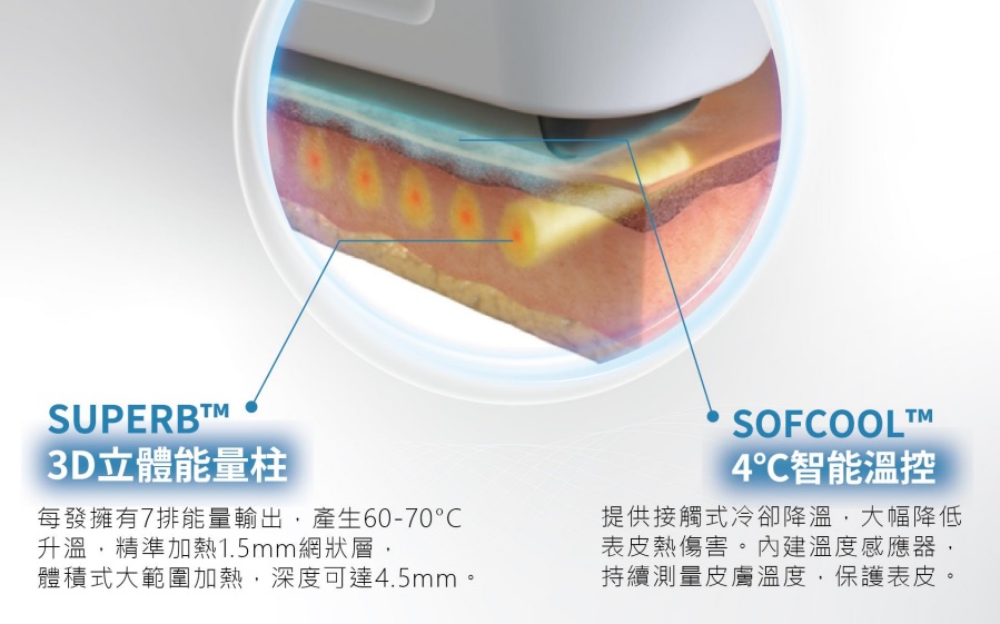 索夫波創新的SUPERB TM專利技術單次擊發即擁有7排3D立體能量柱,採用容積式加熱,能量可以更均勻且大範圍的加熱皮下組織,以膠原蛋白變性最好的溫度(60-70℃)精準加熱網狀層,全臉2100排3D立體能量柱,提升13倍的膠原蛋白新生區域,全面促進膠原蛋白、彈力蛋白和玻尿酸的新生和重組。