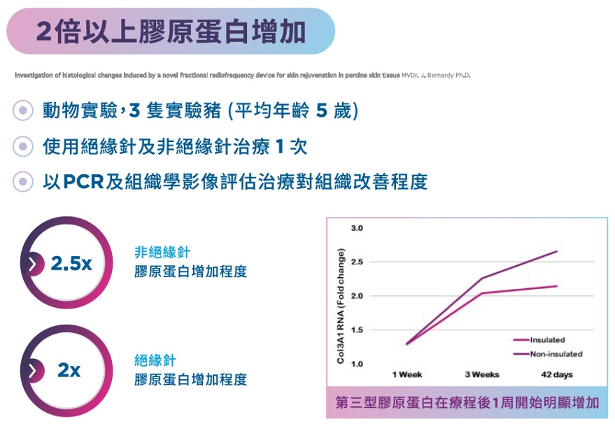 臨床效益:膚質改善、皺紋細紋改善、皮膚緊緻拉提、疤痕組織改善。