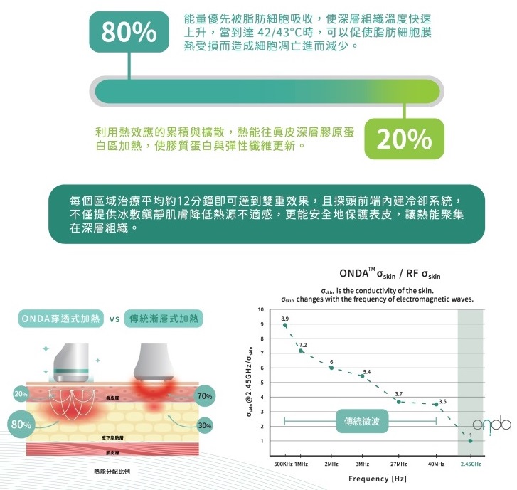 「ONDA昂達超微波」之2.45GHz對皮膚低阻抗的特性可使傳導率優於傳統電波高達3.5倍,有效快速穿透表皮層與真皮層,同時2.45GHz針對脂肪具有高效率吸收作用,對組織可產生80/20之熱能分配法則,讓效果更接近完美。