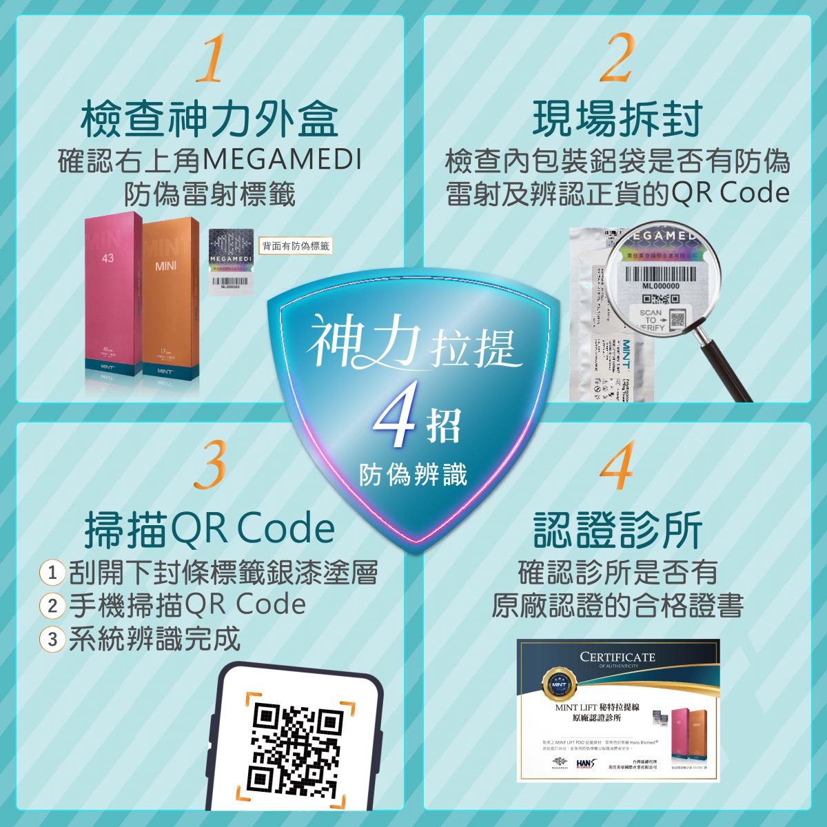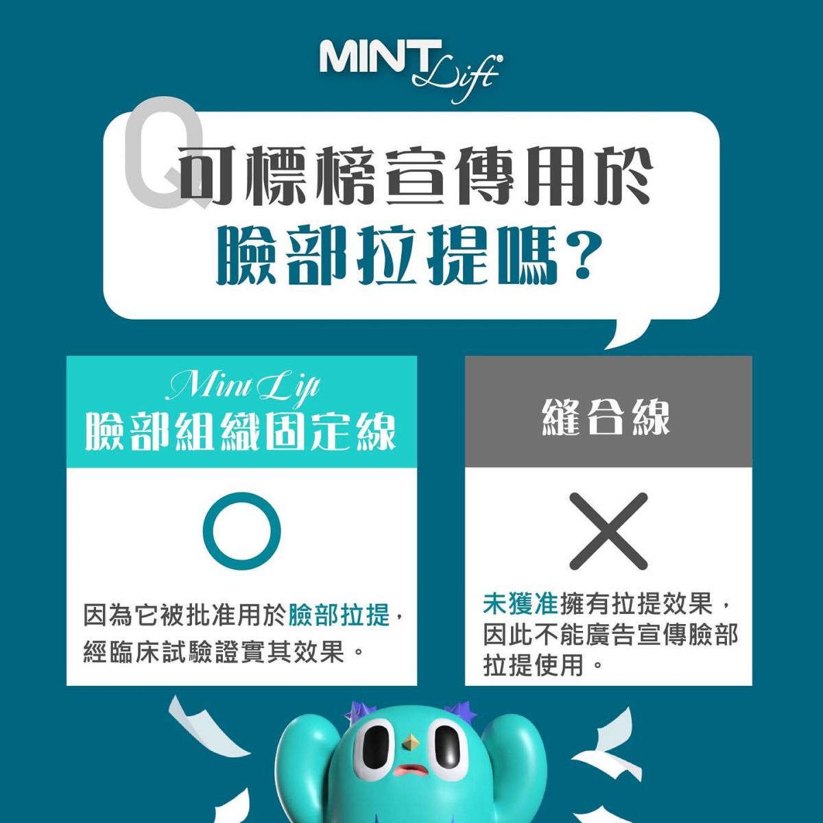 透過衛福部食藥署(TFDA)認證為二級醫療材料。MINTLIFT主力於改善皺紋 拉提鬆弛等使用,屬於 "臉部組織專用固定線" ,非一般外科手術縫合線。