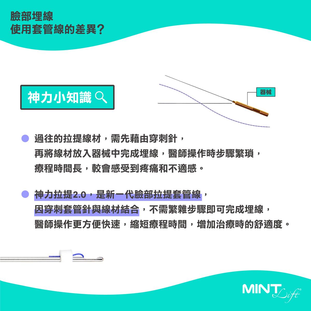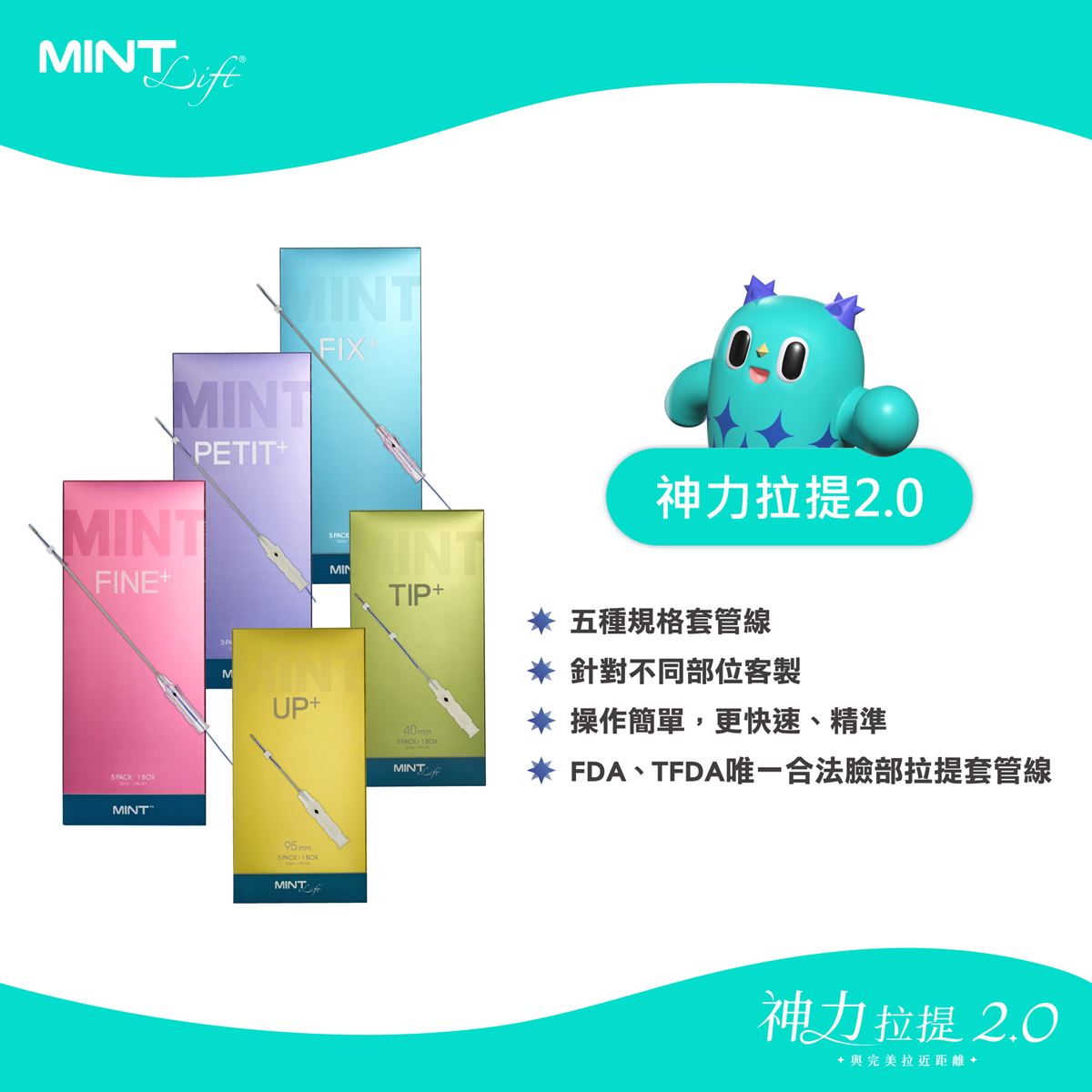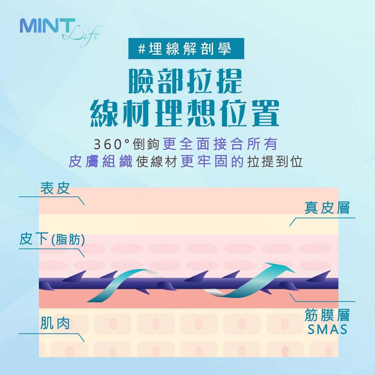 MINT LIFT使用可被人體吸收的PDO(聚對二甲基羥已酮),利用微創技術將拉提線埋在髮際線內,傷口小且不明顯,並透過特殊設計的3D立體倒鉤均勻施力在皮下組織,並刺激膠原蛋白。