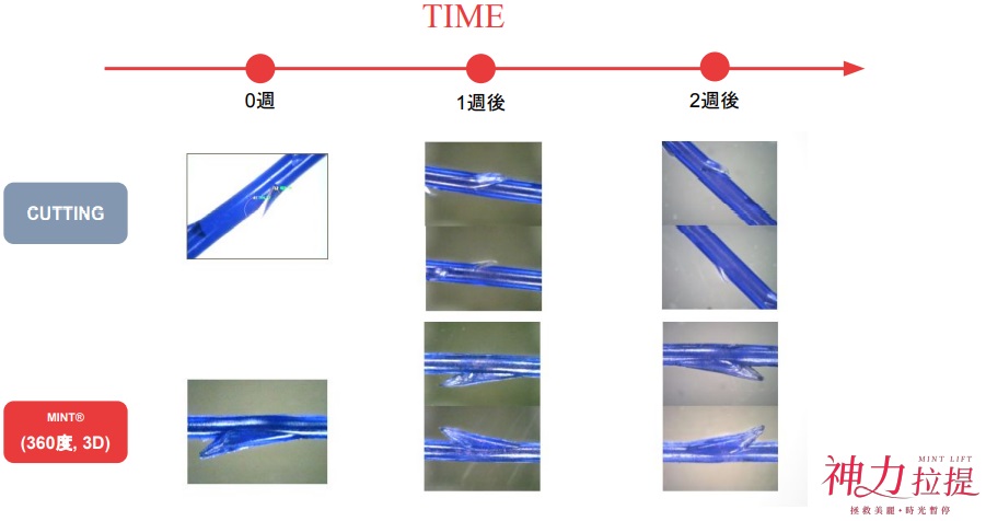 約六個月後,MINT線材將逐漸被人體吸收,而增加的膠原蛋白則將原本鬆弛下垂的部位自然拉提,添增澎潤感,達到更持久的效果!