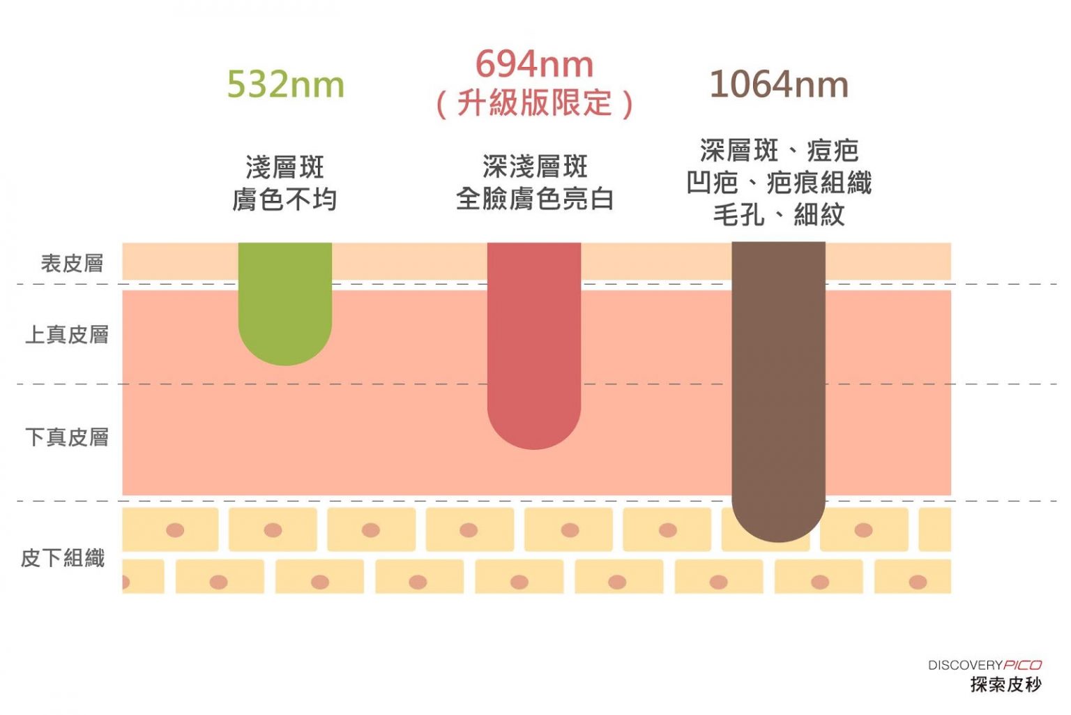 但是,自從探索皮秒升級版出現後,除了原本的1064nm及532nm波長之外,還多了694nm紅寶石雷射波長(目前也沒有任何一台皮秒雷射擁有真正的694nm紅寶石雷射波長),對於黑色素清除率極高,加上三波長作用下斑點無所遁形!