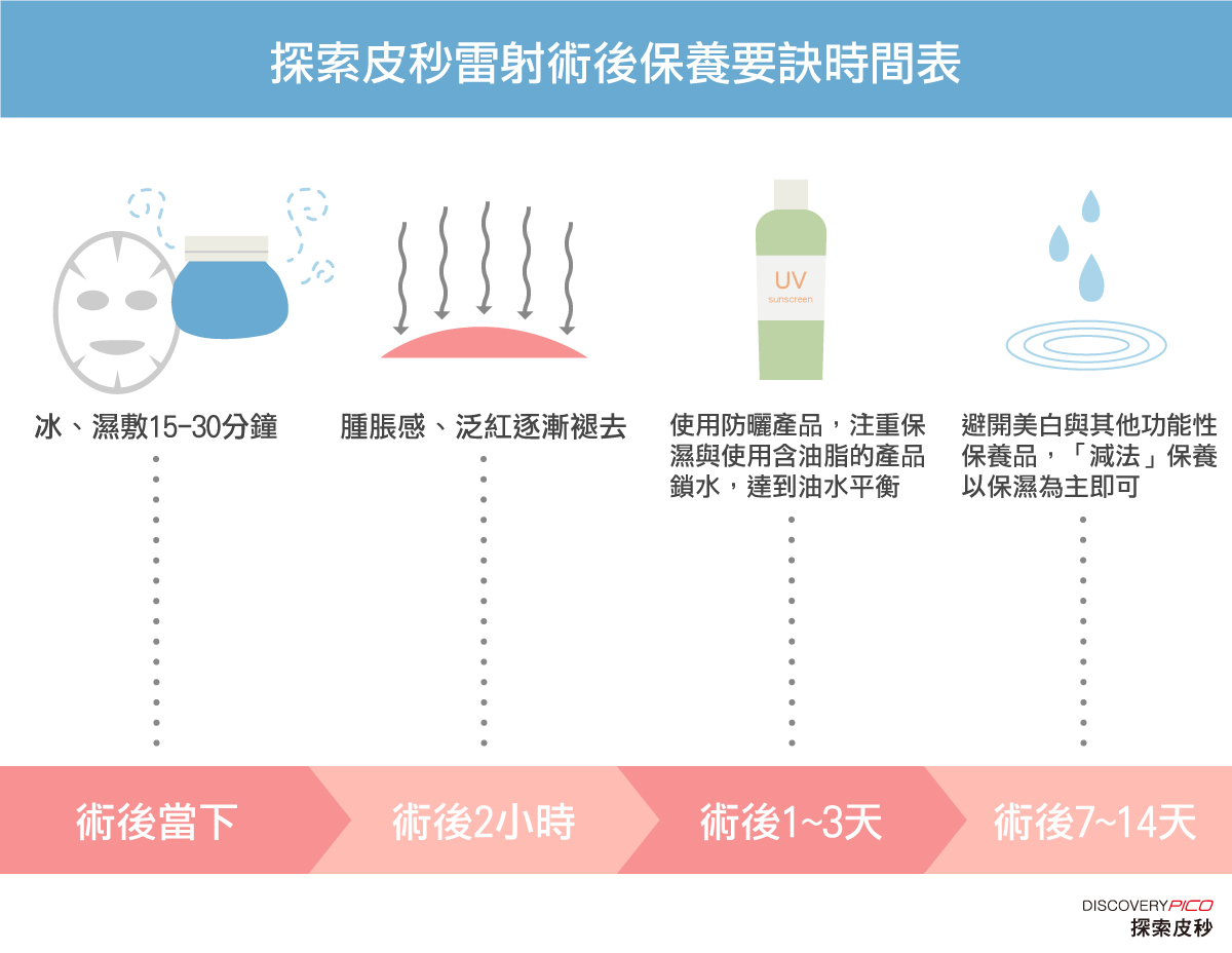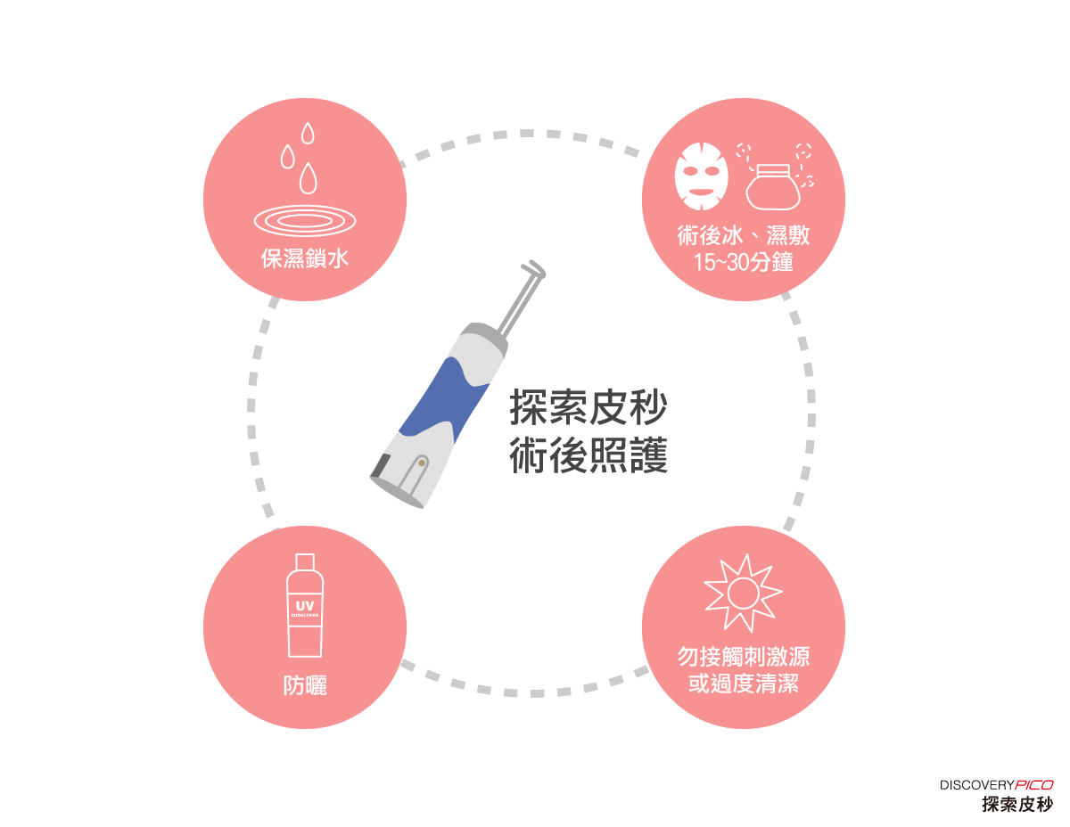 ►雷射除斑後會形成痂皮,約莫3-5天內會自然脫落,而痂皮脫落後,肌膚會呈現粉紅色,約1週後會回復正常膚色。在痂皮未脫落前,切勿用力摩擦患部或以外力撕下。請勿過度曝曬陽光並加強防曬,外出時建議塗抹SPF 30以上之防曬乳並配戴遮陽帽或遮陽傘。