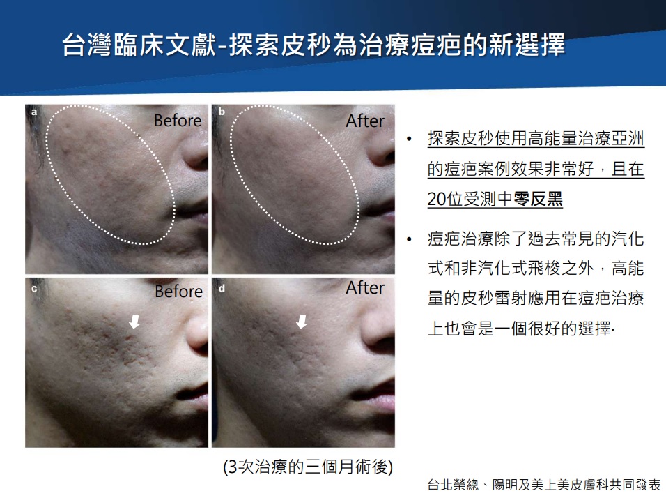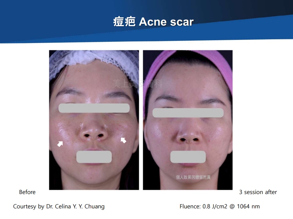 →2.利用皮秒所產生的小空泡,啟動肌膚新生,重新激活膠原蛋白,改善腦人凹凸疤痕。經臨床醫師回饋,術後產生紅腫及反黑副作用約<1%。