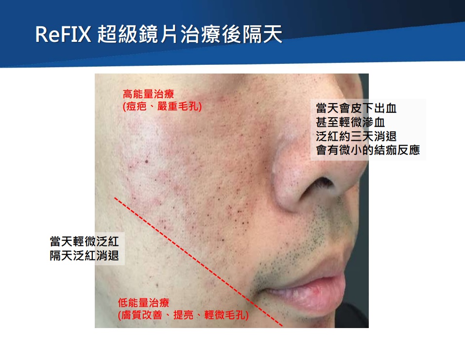 ►ReFIX超級鏡片 改善凹疤或縮小毛孔療程後,治療部位會有些微紅腫,依據不同適應症以及個人體質差異,約莫1-4小時後會退去。若有輕微灼熱現象可加強冰敷降低不適感。