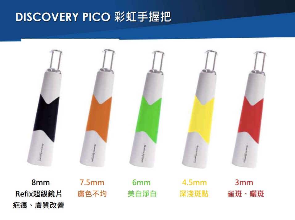 探索皮秒配有多支探頭,彩虹探頭是探索皮秒雷射的一大優勢,醫師可根據客人的症狀、治療面積、深度去做選擇圓形、方形及聚焦3種不同的探頭形狀,其中圓形光點專門用於治療斑點,針對肌膚上不同的問題、不同斑點型態選配適合的探頭,光點大小更精準治療。便能一次解決所有問題,消費者不必為了提亮膚質、縮小毛孔、除斑而多跑好幾趟,省時省力。