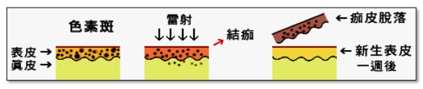 含有黑色素的部位倍雷射光照射後, 會立即結痂. 經過數日後隨著痂皮掉落而去除淺斑.
