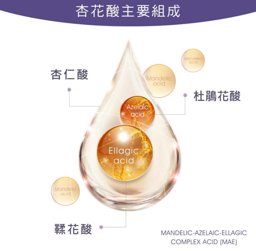 如果不要!您將有更好的選擇!杏花酸以 NLC 技術將杏仁酸、杜鵑花酸及鞣花酸合成最新一代複合式果酸。