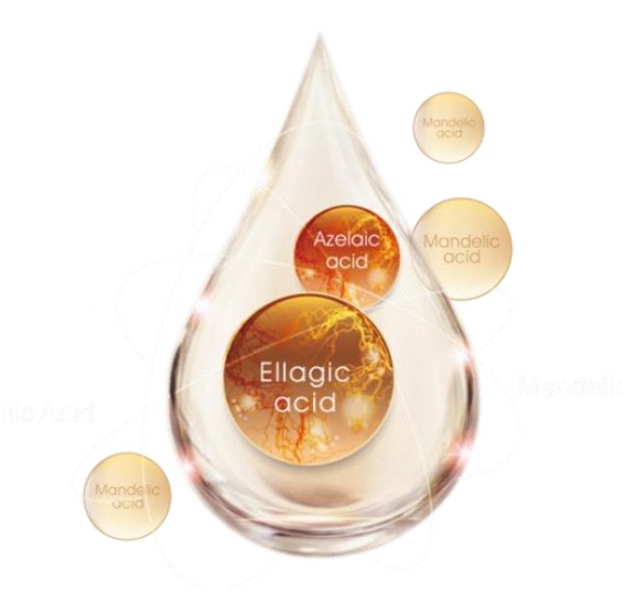 經過多年的研究 Scilec Inc. Alpharetta GA USA 結合杏仁酸、杜鵑酸和鞣花酸終於誕生出最新一代複合酸 杏花酸(Mandelic-Azelaic-Ellagic Complex Acid)。