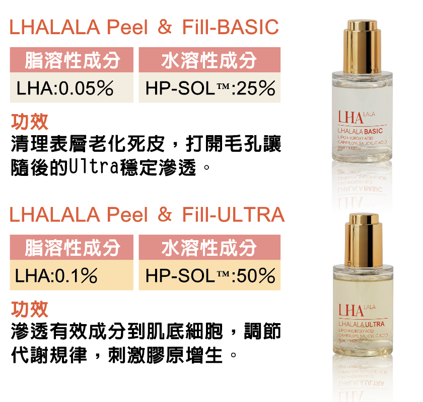 韓國獨家專利鹼性技術,採用L’OREAL萊雅專利微剝成分LHA辛醯水楊酸搭配專利鹼性配方,多元化療程同時搭配雷射治療,成分極為溫和,安全無刺痛感、無修護期,輕鬆煥膚不破壞肌膚屏障,能精準剝除角質卻不刺激肌膚。肌膚光滑細緻、膚色提亮,效果立即呈現。BASIC表皮層煥膚+ULTRA中皮層再生兩劑組成。