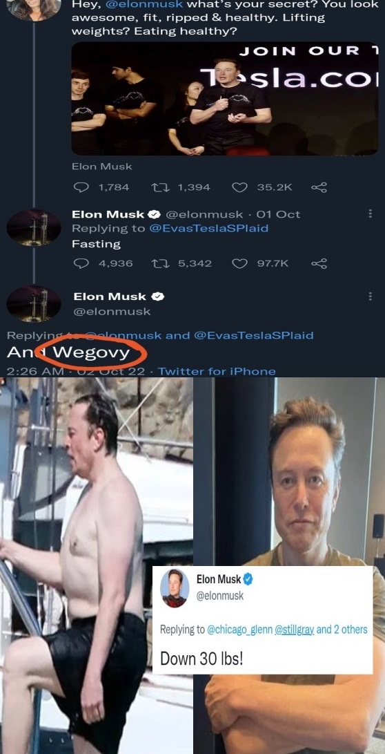 結果收到伊隆·馬斯克自信滿滿的回覆:「Fasting and Wegovy(禁食和Wegovy)。」