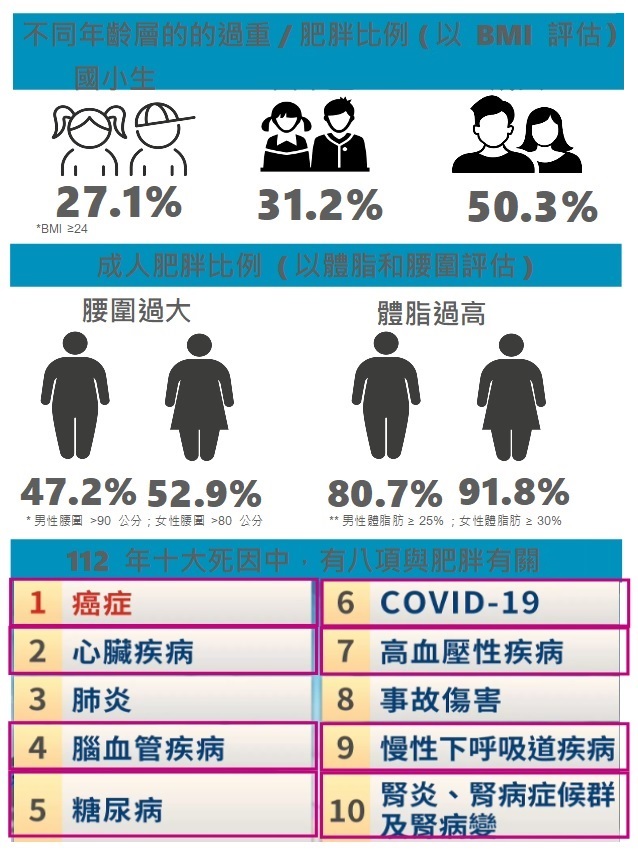 * 藥物處方─根據藥物之適應症及禁忌症,評估病患是否需要且適合使用減重藥物;目前合法的減重藥物健保並不給付,需自費處方。此外,對發現已有慢性疾病之患者,則將開立適當之治療藥物。