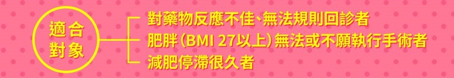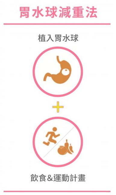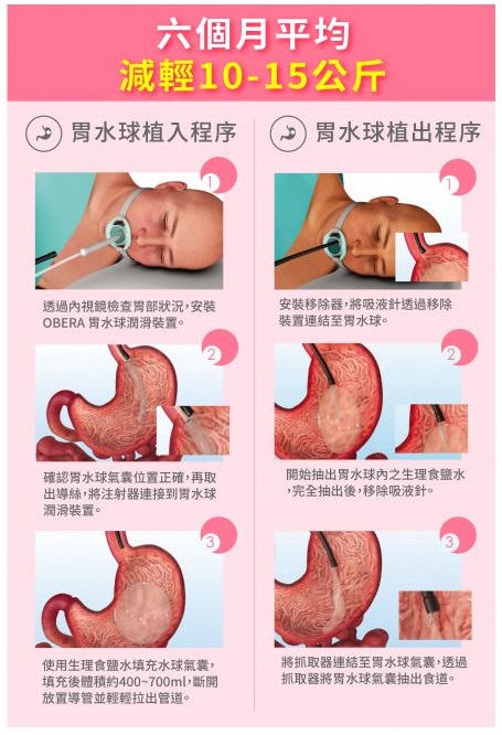 將水球藉由胃鏡置入胃中,再將生理食鹽水注入水球內,藉由水球填充胃部產生飽足感, #以降低食物攝取量的方式達到減重效果。