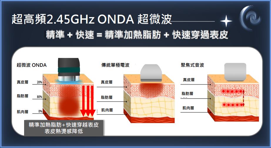 ONDA昂達超微波是什麼? 「ONDA昂達超微波」之2.45GHz對皮膚低阻抗的特性可使傳導率優於傳統電波高達3.5倍,有效快速穿透表皮層與真皮層,同時2.45GHz針對脂肪具有高效率吸收作用,對組織可產生80/20之熱能分配法則,讓效果更接近完美。
