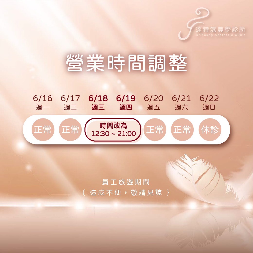 【一年一度員工旅遊】達特漾美學6/18(三)~6/19(四) 營業時間改為『12:30-21:00』6/20(五)~6/21(六)營業時間正常造成不便 敬請見諒