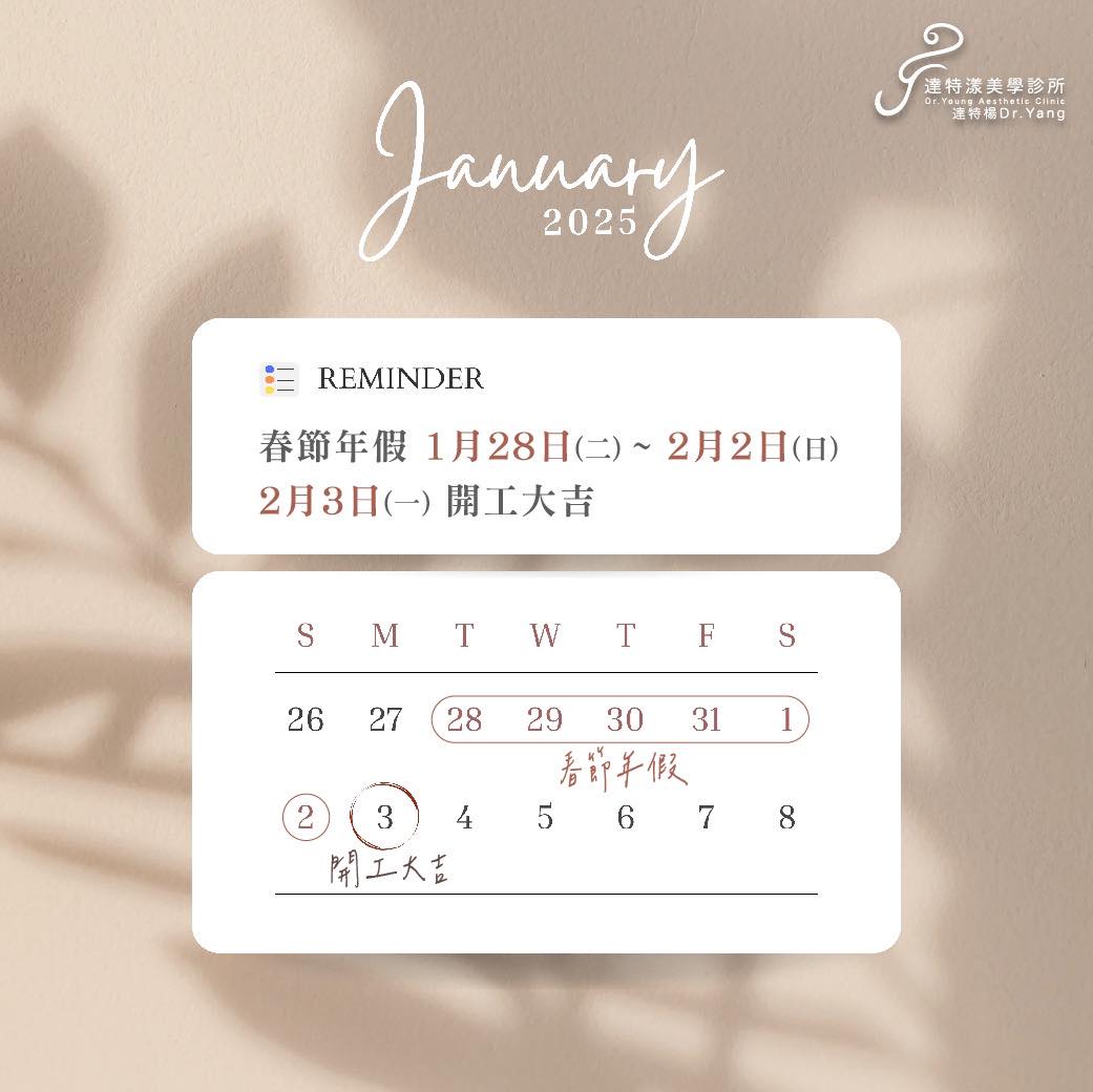 【達特漾美學診所春節年假公告】除夕1月28日(二)~2月2日(日):休診六天!2月3日(一)號開工大吉想要美美的過春節,敬請把握時間盡早預約喔!線上預約高雄整形外科諮詢:https://lin.ee/dfkXuYv