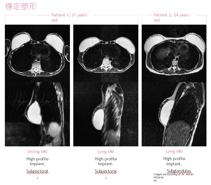 ♦凝膠的設計具有塑形穩定性,透過MRI顯示,在站立和仰臥位置能顯示自然乳房組織輪廓。