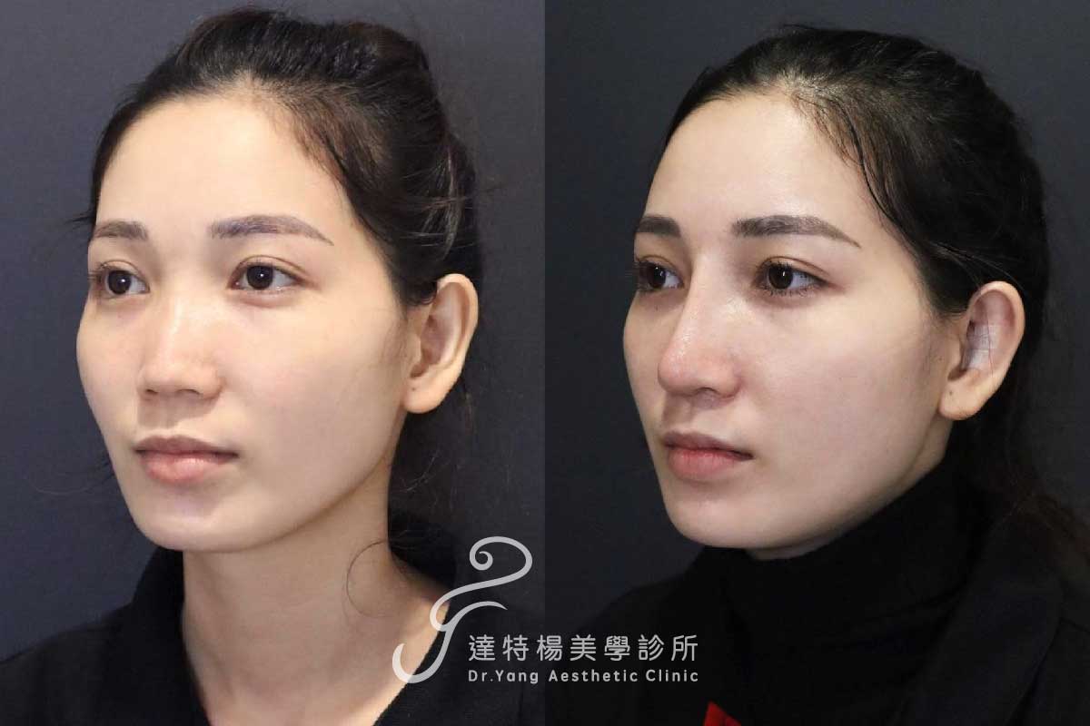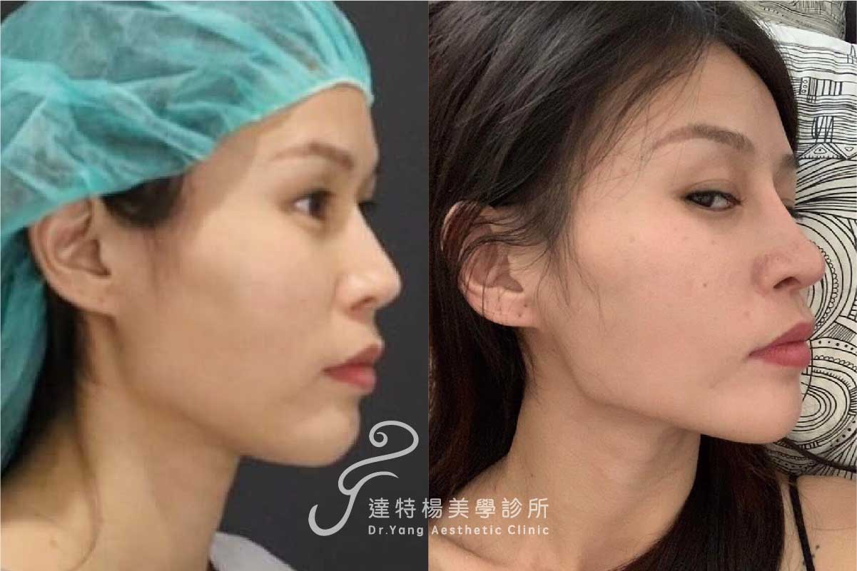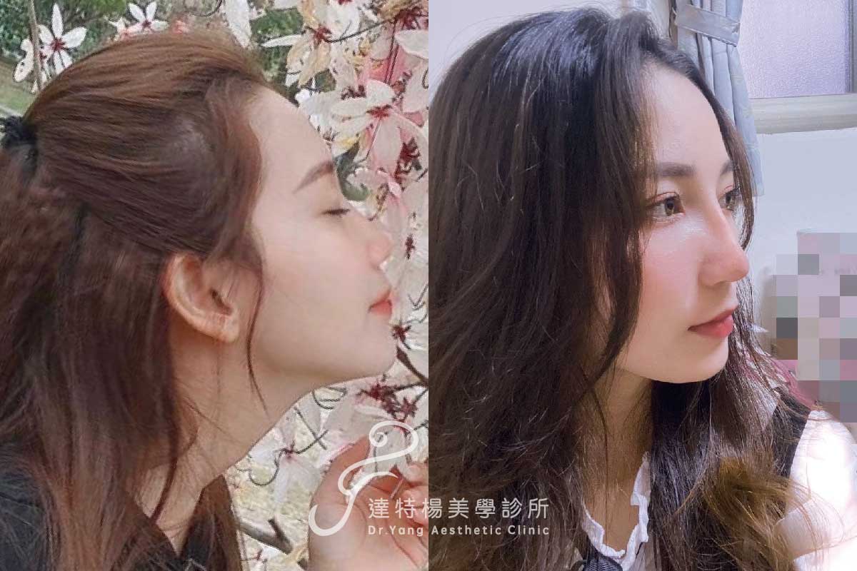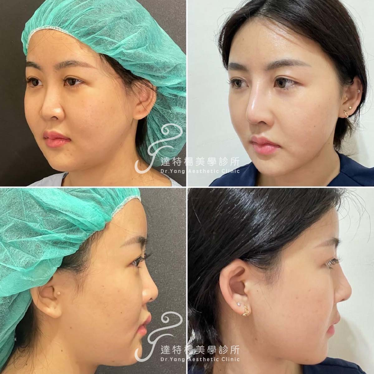 這位美眉透過三段式隆鼻改善了鼻柱不順暢的問題,原先的鼻型讓美眉看起來比較剛烈,三段式隆鼻手術(又稱為複合式、結構式隆鼻),透過假體或自肋墊高延長鼻梁,再取適合的耳軟骨來撐起鼻頭的部分,讓鼻尖能更好的塑形也能有保護鼻頭不被鼻模刺穿的風險,延長鼻中膈軟骨的部分,讓鼻型更加挺拔。三段式隆鼻手術過程比較繁瑣且環環相扣,非常考驗醫師的技術及美感,全方位的考量才能朔造出客製化的理想鼻型。