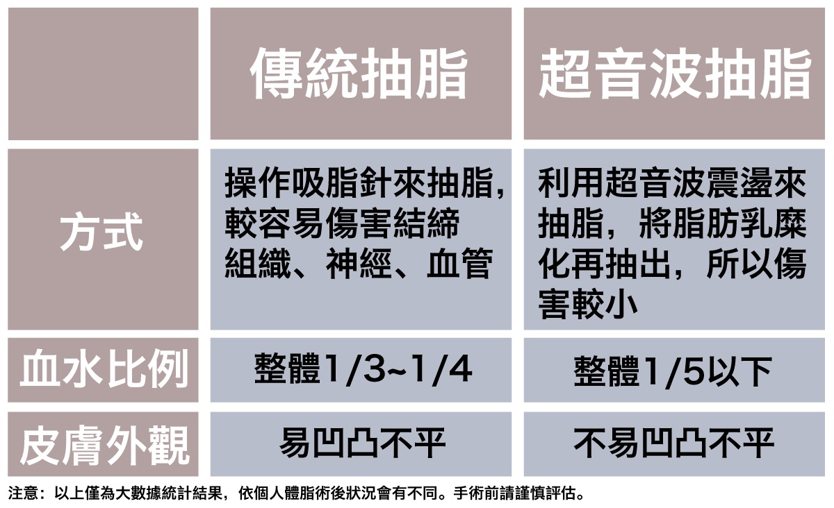 超音波抽脂 就是利用快速震盪作用,在不會傷害神經和血管的條件下將脂肪細胞膜碎解,使之成為乳靡狀,再利用負壓抽脂管將已乳化成液態的脂肪吸出體外,因此比起傳統抽脂,將結構完整的脂肪組織強力吸出的方式,對神經血管的傷害降低了許多,超音波溶脂乳化脂防時會產生攝氏四十至四十五度的熱能,能達到拉緊表皮的緊膚效果,手術的出血量也可以控制到最低,客戶可以在術後觀察到抽出物中幾乎都是脂肪,只有極少量的血水。因此術後不但恢復期縮短了、之後的表面凹凸不平和局部鬆弛的情形也大幅降低許多。這種運用在大範圍的脂肪移除技術,能明顯的達到呎吋縮小的效果,對許多做過傳統抽脂,效果不滿意的客戶,是最佳的選擇。
