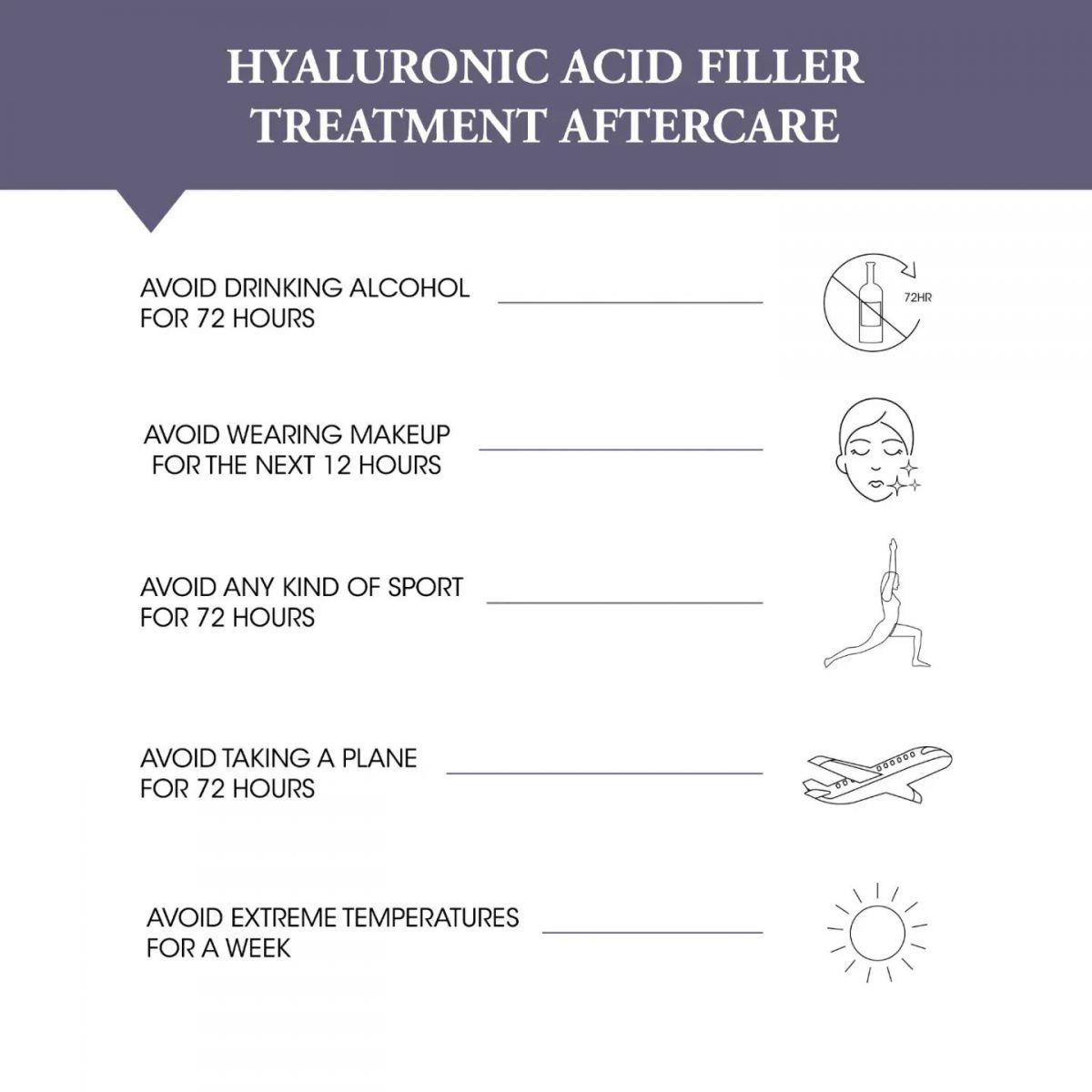 A:各位愛美的小夥伴,在玻尿酸療程後是否有適洽的保養及愛護自己的肌膚呢?若不知道哪些是該避免去觸碰的禁忌行為,請參考圖片內的貼心提醒喔