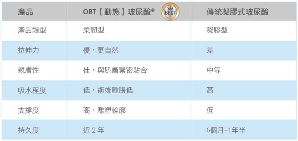 以專利動態優化技術(OBT;Optimal Balance Technology),提高玻尿酸凝膠的拉伸力 (Flexibility),能使注入後的玻尿酸,隨著表情擺動,怎麼動都自然!