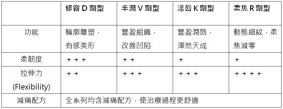 *越細的動態紋路,建議可選擇拉伸力較為優越的劑型;需要支撐拉提的地方選擇柔韌度較高的劑型。請與專業醫師討論適合您的治療方案