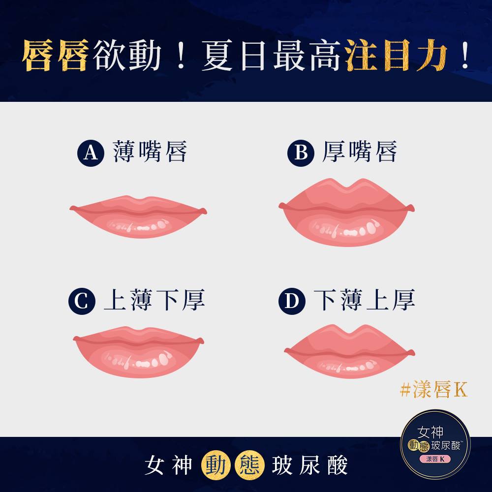 要甜美?要性感? 小朋友才做選擇,姊姊我全都要! 但是要怎麼樣才能兼具甜美又性感呢? 謎之聲:其實關鍵就在嘴唇啦 - 看看安潔莉娜裘莉、舒淇、石原聰美都以豐唇著名 古時候更有豐唇是重情義的說法 妳也想追求豐滿嘟嘟厚唇? 那就快找女神玻尿酸幫忙吧 - 更推出四種劑型設計,想讓哪變美就讓哪變美 〔女神動態玻尿酸〕針對豐唇設計的〝漾唇K〞 透過我們獨家研發的動態平衡優化技術 達到柔順、自然服貼,兼顧支撐、高拉伸力的效果 打造母胎美人般的誘人澎潤感 讓妳每個角度、每一抹笑靨都生動迷人 - 澎出魅惑豐唇