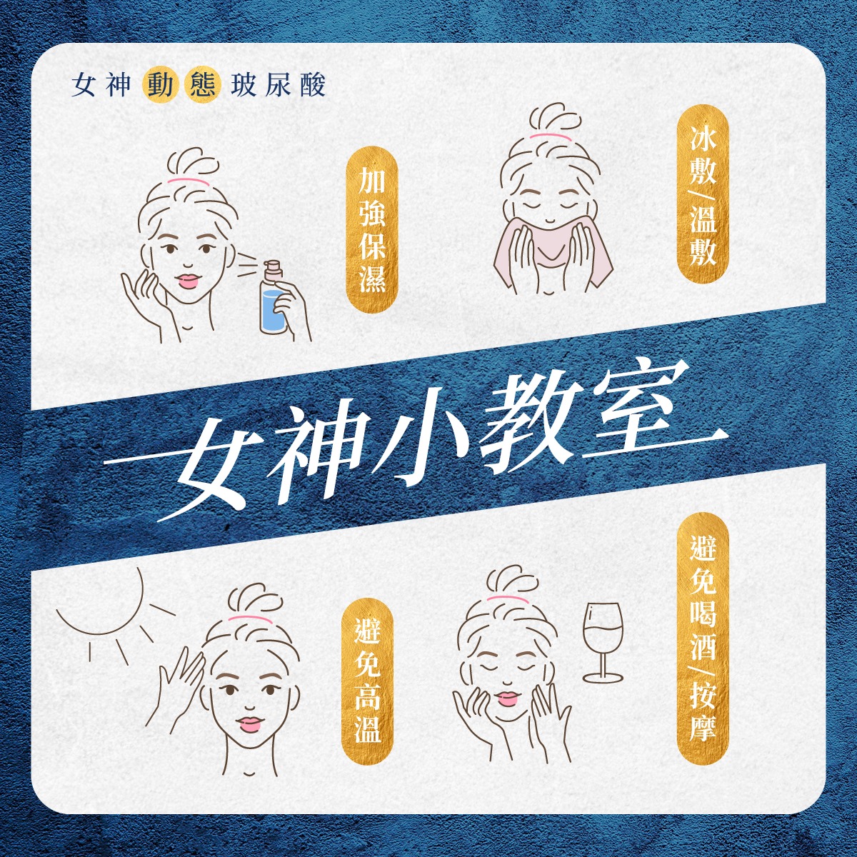 女神今天來教大家: 「施打玻尿酸後,要注意的部分!」 - 加強保濕 施打玻尿酸當下,肌膚下陷處會被填補 持續保濕、給予水份,皮膚會更飽滿