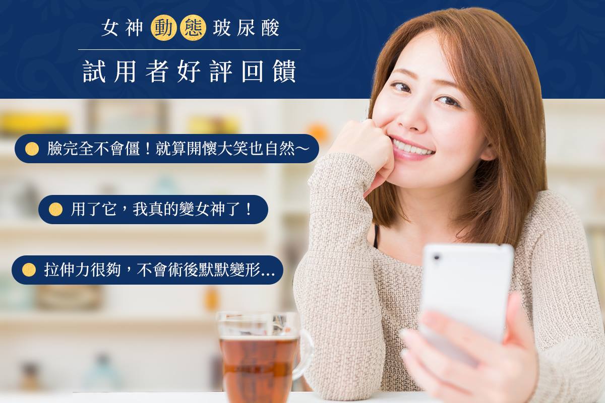 低頭族看過來,小心一看臉就洩漏年齡 低頭狂滑手機~臉型也慢慢的滑走? 一不小心就被地心引力拉垮妳的美! 有女神〔動態〕玻尿酸,讓妳維持高顏值 - 眾多女神指定女神〔動態〕玻尿酸 柔韌型玻尿酸,塑形更柔順更自然 高支撐、高拉伸特性,五官更立體 國際認證,美國FDA、台灣衛福部核可 - 選擇女神〔動態〕玻尿酸 不讓人一眼看穿妳年齡