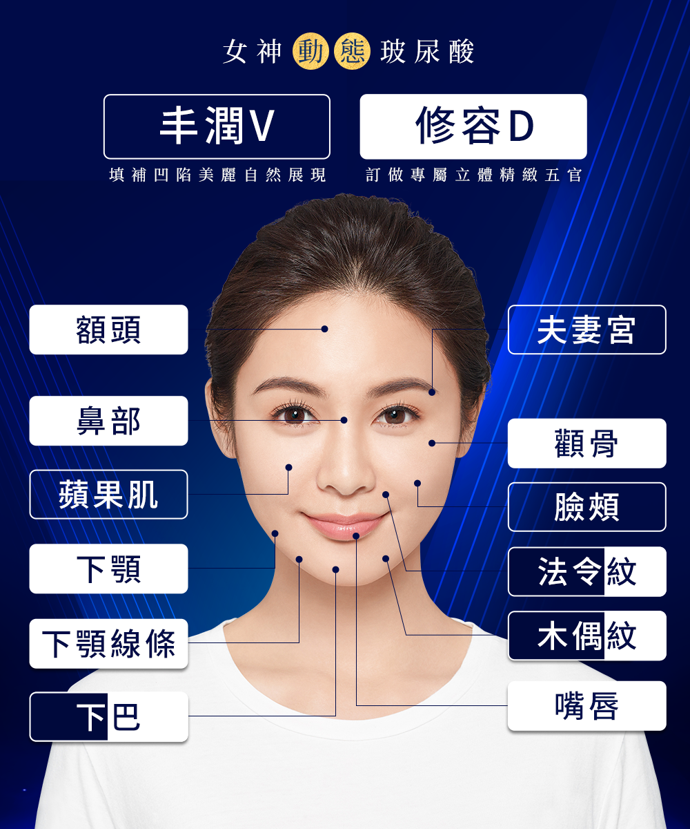 女神〔動態〕玻尿酸 動態平衡優化技術,柔順、自然服貼 漾唇K:雙唇豐潤更誘人 柔焦R:動態修飾更無痕 丰潤V:平整澎潤更青春 修容D:五官修容更立體-