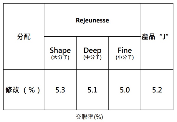交聯率 Rejeunesse 的5.0-5.3% 交聯率相當於產品 J 的 5.2% 紅色突出部分表示Rejeunesse的交聯率