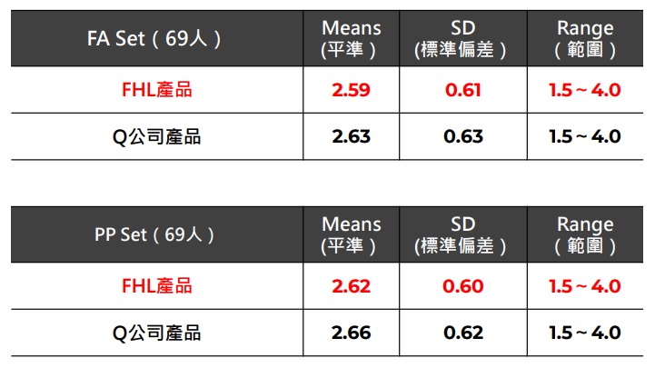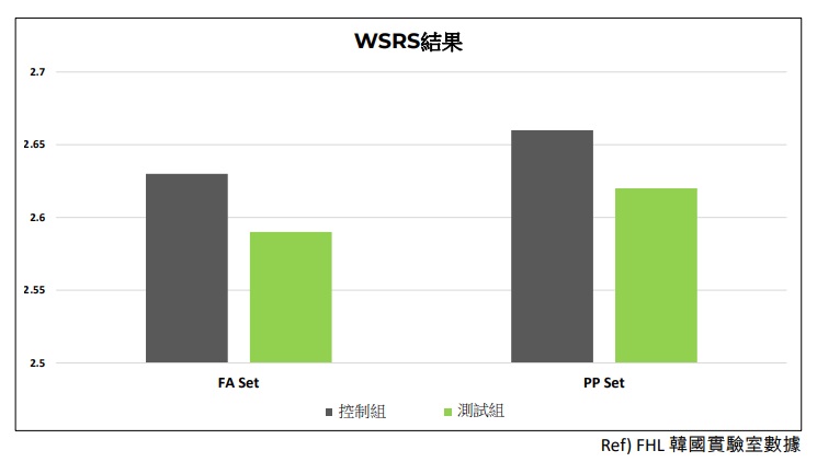 皺紋嚴重程度 (WSRS) 臨床實驗 6個月後皺紋嚴重程度視覺評估(WSRS)結果——數字越低,皺紋越輕 FHL的產品比Q公司的產品優0.04