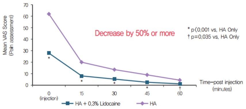 利多卡因的止痛效果 含有 0.3% 利多卡因的 HA 填充劑可緩解注射期間和注射後的疼痛 HA 沒有物理或化學特異性,因此减少了副作用 利多卡因治療可有效的緩解施打者的感受 多項研究表明,與利多卡因一起使用可以減少腫脹、紅斑,甚至瘀傷