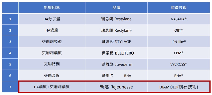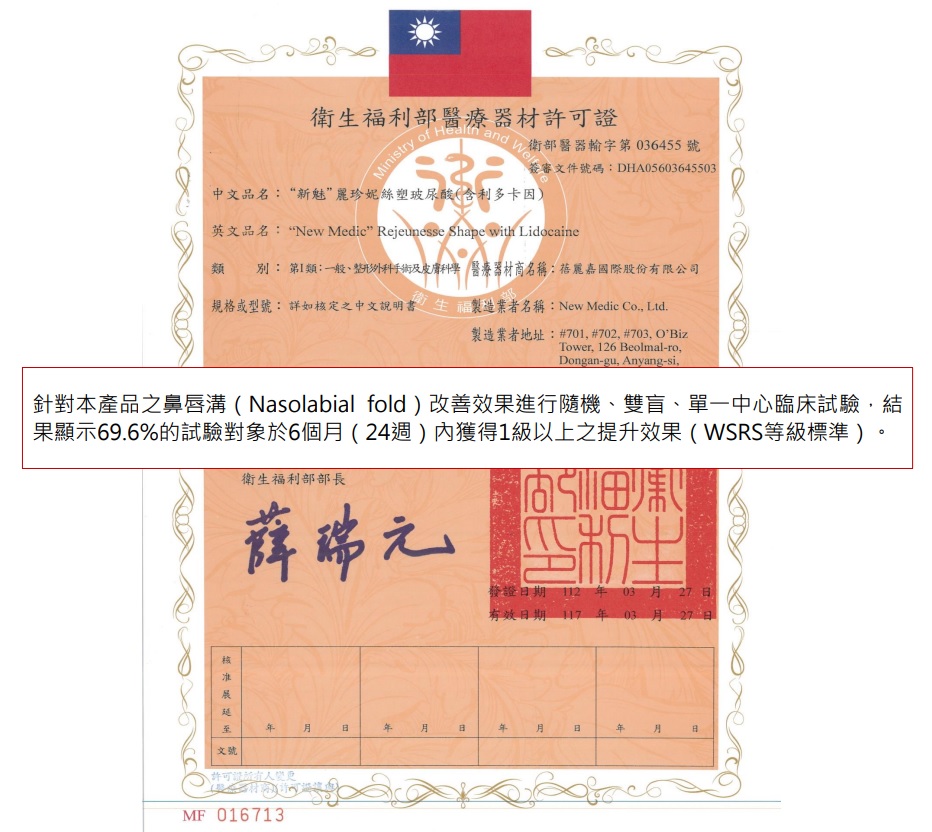 新魅-麗珍妮絲塑玻尿酸重點特色 • Rejeunesse新魅玻尿酸→是非動物玻尿酸和無殘留交聯劑構成,是完全可以在人體代謝 • 原料品質高→於歐洲藥典要求,無論核酸、蛋白質或內毒素的含量都低於歐洲標準 • 歐盟最高標→製造基地規模和設備完善,擁有韓國KFDA、台灣TFDA、歐盟CE的全球多國認證 • DIAMOLD鑽石專利技術→增強了玻尿酸凝膠的延展性和凝固性 • 高安全性→高分子量玻尿酸(HA) 可減少使用交聯劑(BDDE ) • 高黏彈性→ FHL獨特的交聯過程配置(時間/溫度) • 獨特的透析工藝→去除雜質和殘留BDDE / 成型維護(Form) • 穩定的注射性→為醫生或臨床醫生提供穩定、易於使用的產品 • 含麻0.3 %利多卡因→治療期間可為客戶帶來舒適的效果 • 維持效果高→玻尿酸的單位濃度越高持久性愈好,在人體內被酵素或自由基分解的阻力就越高 • 交聯結構緻密→空間交聯結構緻密,注射後吸水率極低,大大降低了術後紅腫和疼痛感