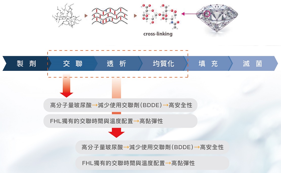 FHL生產的透明質酸填充劑產品是屬於單相凝膠型玻尿酸,為了彌補單相凝膠型玻尿酸的缺點和吸收雙相顆粒型玻尿酸的優點,開發了DIAMOLD技術。 DIAMOLD(鑽石)是“Dialysis”(透析)和“Molding”(成型)的複合詞,它是一個技術名稱,意在表達決定公司產品特性的配置、交聯、透析和調製等主要工藝。在配置過程中使用“高分子透明質酸”可以最大限度地減少”交聯劑的使用使產品的“安全性”提高。 FHL開發 Diamold Technique有兩個目的:去除雜質和交聯劑,並盡力減少注射後所產生的過度膨脹。 再有決定透明質酸黏性黏度和彈性的交聯過程是由「透明質酸的分子量和濃度,交聯劑的種類和濃度,還有交聯溫度和時間」決定的。 特别是交聯溫度和時間是决定透明質酸凝膠性能的主要因素。