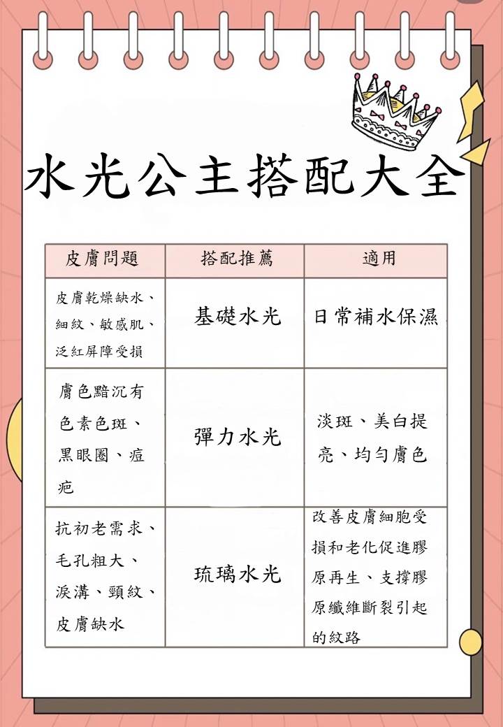 基礎水光︰主要成分是小分子玻尿酸,可以補水保濕,適合缺水性皮膚、毛孔粗大、痘疤、暗沉的人群作為日常保養。 彈力水光︰主要成分是膠原蛋白,可以針對皮膚暗黃、色素色斑、細紋、黑眼圈適合有早衰、抗衰需求的人群。 琉璃水光︰主要成分是PLA(聚乳酸)+HA功效型水光,適合有細紋、鬆弛等初老問題的人群,恢復皮膚彈性、長效保濕、頸紋保養。