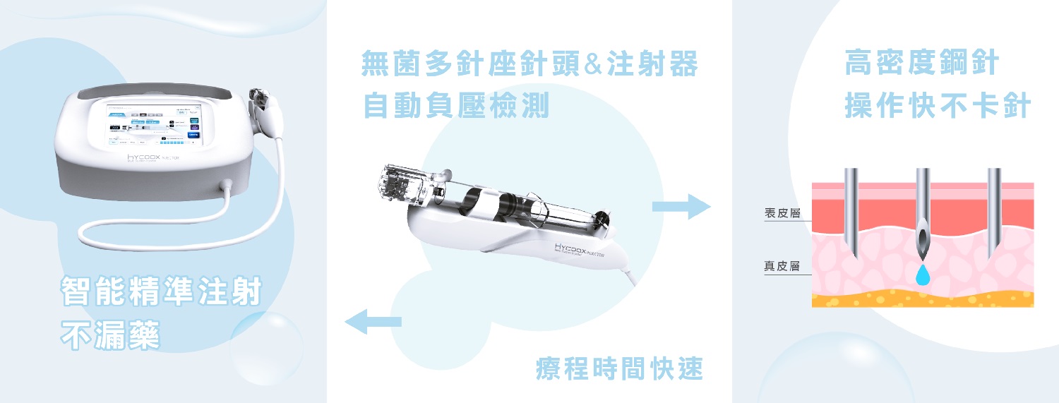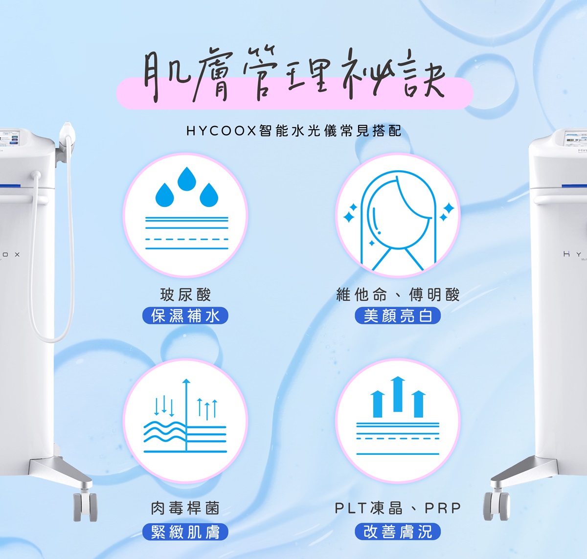 HYCOOX海庫斯智能水光儀 俗稱「水光槍」或「水光針」,通過台灣衛福部認證,配有高科技感知負壓自動注入系統,可依每個人的膚質情況及施打的部位。將玻尿酸與藥劑精準的注射進真皮層,同時保施補水、滋潤角質層、收縮毛孔、袪除皺紋,再現肌膚青春。