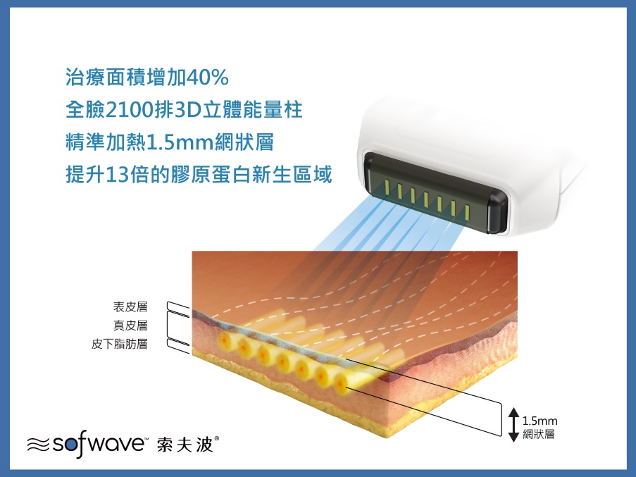 如果說電音雙波是新時代的發明,Sofwave索夫波就是新一波的劃時代的抗老黑科技,單一療程結合了電波的緊緻和音波的拉提優勢,以SUPERB專利技術3D立體能量柱創造容積式加熱,不僅加熱溫度超越電波,也比音波的點狀拉提更為全面,為肌膚創造更好的膠原蛋白新生力,讓緊膚拉提一次到位,引領著全球抗老市場掀起新一波的未來美肌新浪潮。