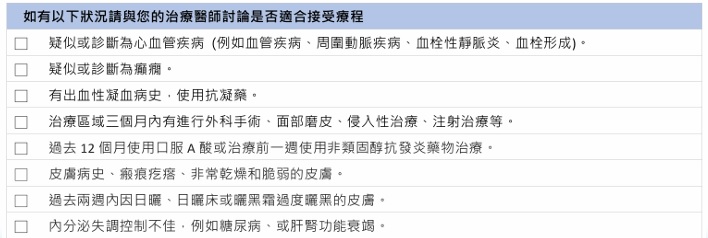 ◼ 治療區域有紋身或永久化妝、癒合不良或未癒合的傷口、永久性植入物、任何類型癌症病史。