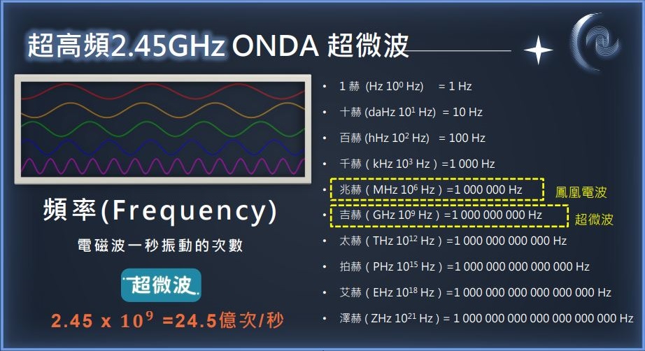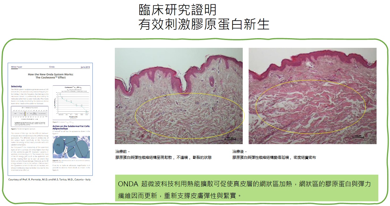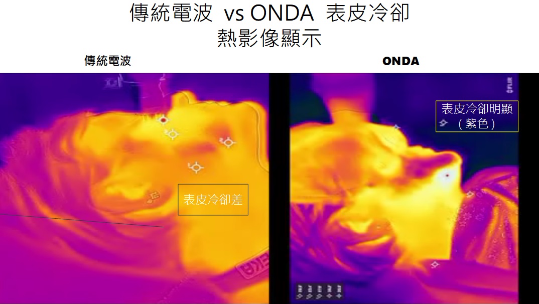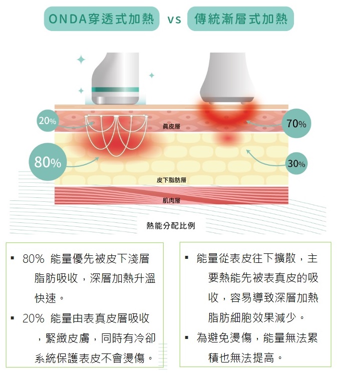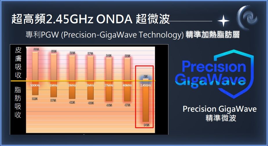 「ONDA昂達超微波」之2.45GHz對皮膚低阻抗的特性可使傳導率優於傳統電波高達3.5倍,有效快速穿透表皮層與真皮層,同時2.45GHz針對脂肪具有高效率吸收作用,對組織可產生80/20之熱能分配法則,讓效果更接近完美。