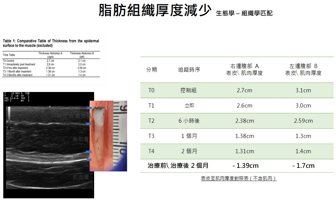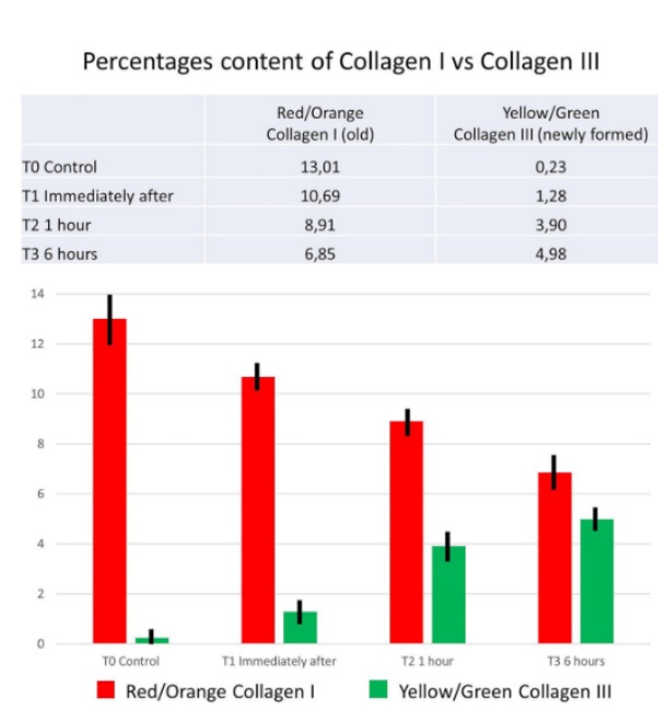 膠原蛋白第 I 型(紅色)含量與 膠原蛋白第 III型(綠色)含量的測量結果顯示,不僅減少皮下脂肪,還可以治療橘皮組織和相關的凹陷、凹凸或橘皮狀皮膚。